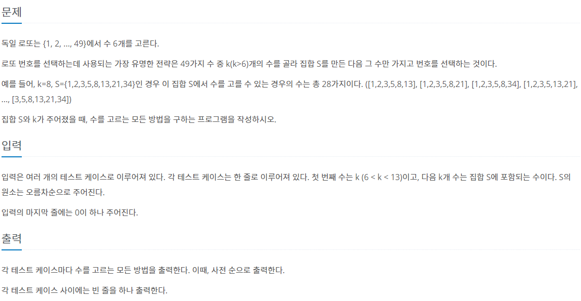 문제 링크 : https://www.acmicpc.net/problem/6603