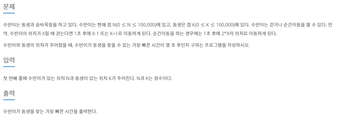 문제 수빈이는 동생과 숨바꼭질을 하고 있다. 수빈이는 현재 점 N(0 ≤ N ≤ 100,000)에 있고, 동생은 점 K(0 ≤ K ≤ 100,000)에 있다. 수빈이는 걷거나 순간이동을 할 수 있다. 만약, 수빈이의 위치가