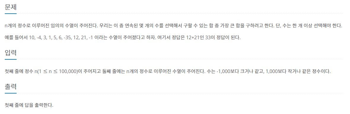 첫째 줄에 정수 n(1 ≤ n ≤ 100,000)이 주어지고 둘째 줄에는 n개의 정수로 이루어진 수열이 주어진다. 수는 -1,000보다 크거나 같고, 1,000보다 작거나 같은 정수이다.
