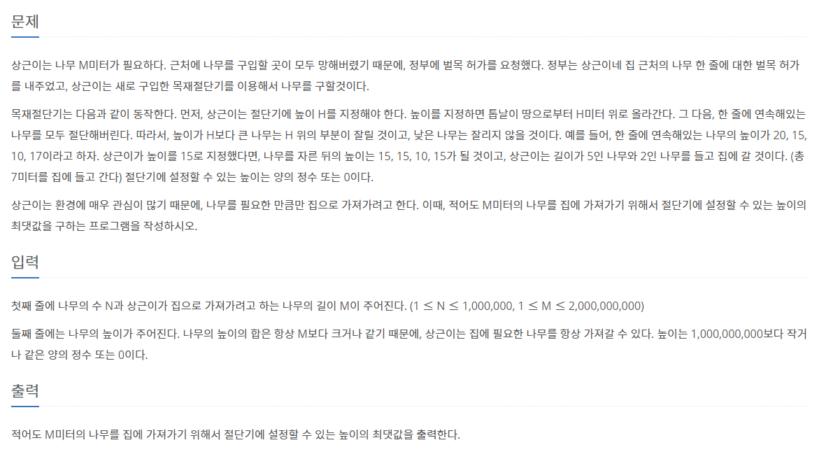 첫째 줄에 나무의 수 N과 상근이가 집으로 가져가려고 하는 나무의 길이 M이 주어진다. (1 ≤ N ≤ 1,000,000, 1 ≤ M ≤ 2,000,000,000) 둘째 줄에는 나무의 높이가 주어진다. 나무의 높이의 합은 항상 M보