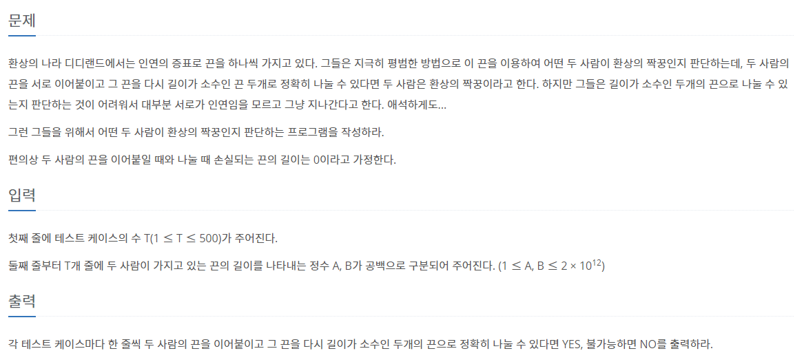 두 수를 합치면 최대 4 * 10^12입니다. 에라토스테네스의 체를 사용하여 제곱근인 2 * 10^6 까지의 소수들을 찾아 이 소수들을 활용하여 답을 구해나갑니다.